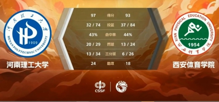 第一个加时张恒连续拿分一度帮助西安体院取得领先,许天佑三分止血,随后河南理工追平比分拖入第二个加时。第二个加时廉岳琪再度挺身而出帮助河南理工建立优势,虽然程勃轩投进高难度三分续命,但最终河南理工大学经过双加时97-93艰难拿下西安体育学院。