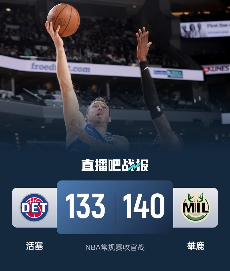 康诺顿生涯新高43+11 库兹马出战一节22分 雄鹿加时击败活塞