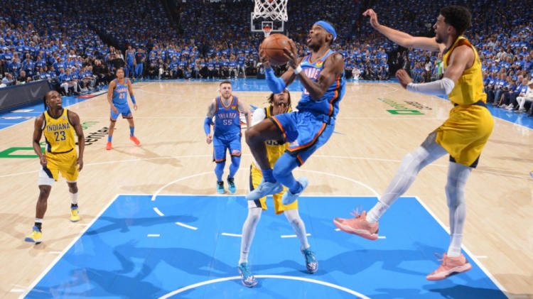 步行者延续了G1收两翼堵中路的策略,篮下防守效果依旧还行,但也依旧防不了SGA。SGA急停顶人中距离太imba,封脸也进。G2雷霆拼图的三分也还行,维金斯成为奇兵,配合SGA点名效果卓著,三分进了5个。加上卡鲁索命中的4记三分,两个板凳席球员就贡献了38分,算把上一场欠大哥的债都还了。加上切特和杰伦初步孵化出人形,雷霆G2的进攻效果好了不少;