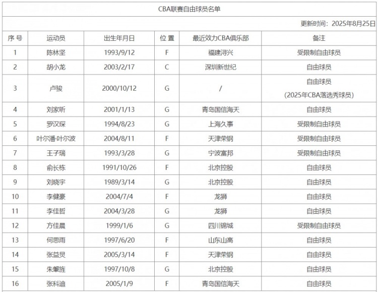 二、自2025年5月21日起,CBA联赛自由球员名单将只保留2025年5月21日及以后申请进入的球员,2025年5月21日以前申请并进入过自由球员名单中的球员可根据规定及要求向CBA公司提交相关材料(发送至邮箱:register@cbaleague.com)继续申请进入自由球员名单。