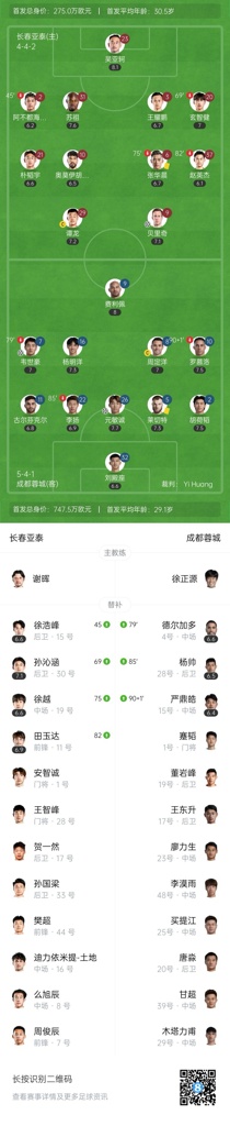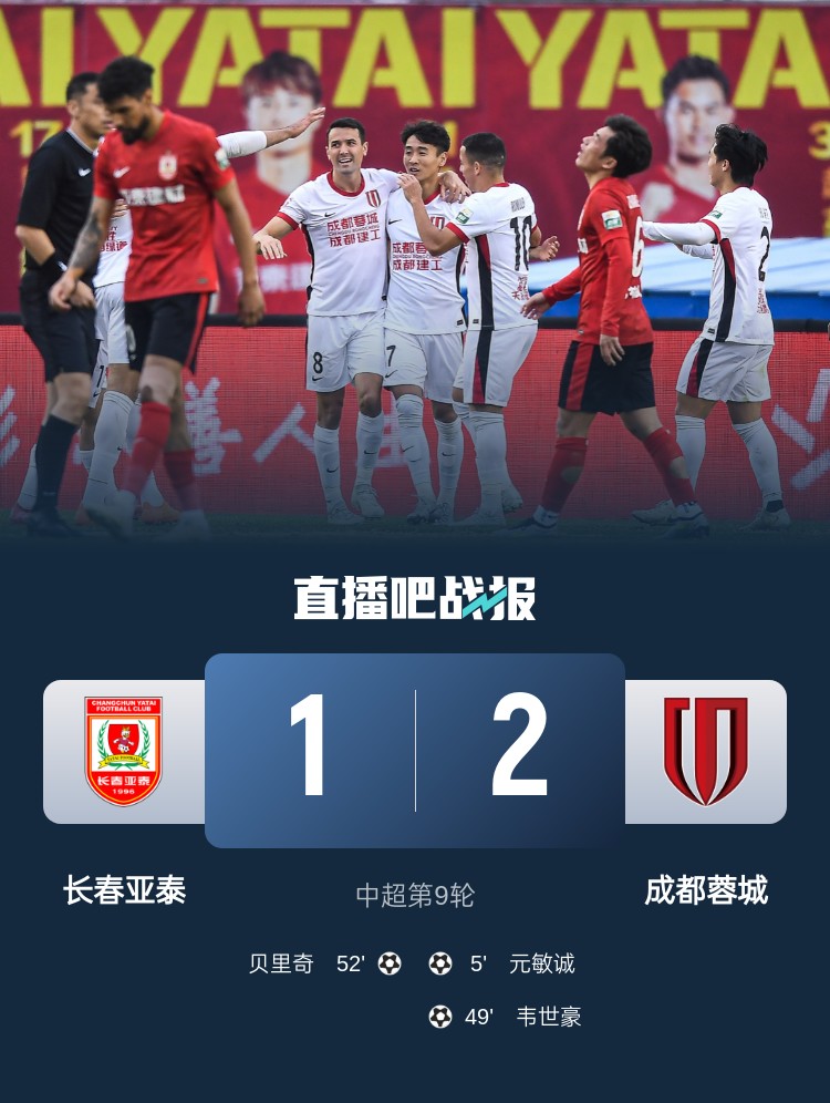 全场比赛结束,成都蓉城客场2-1战胜长春亚泰。