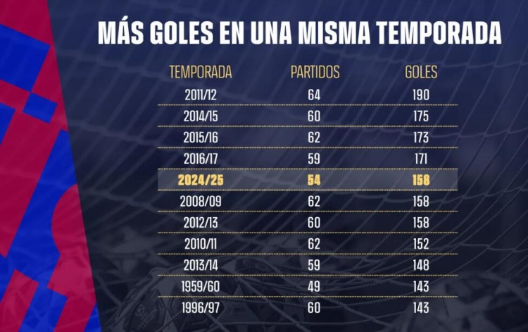 5月1日讯 巴萨官网的消息,当前这支巴萨已成为俱乐部历史上单赛季进球第五多的球队。