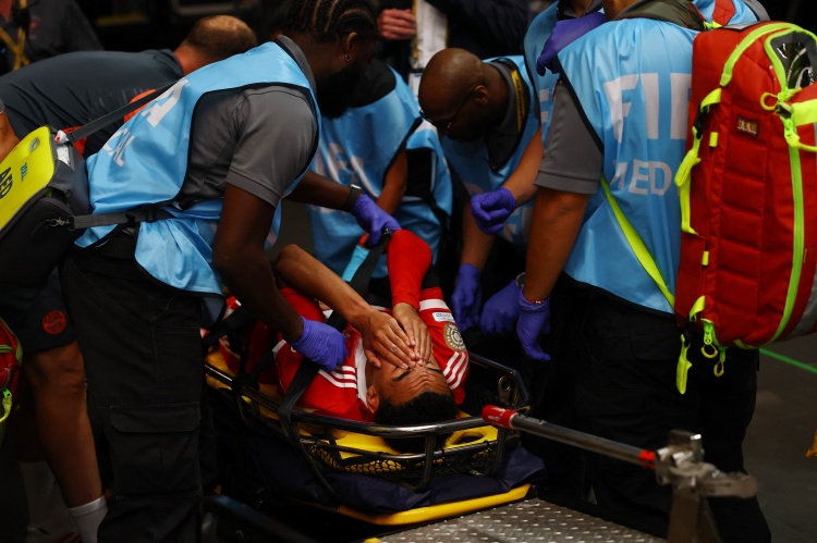 世俱杯1/4决赛,巴黎圣日耳曼vs拜仁慕尼黑,半场结束前,穆西亚拉与多纳鲁马撞在一起,脚踝严重变形,随后被担架抬下场。