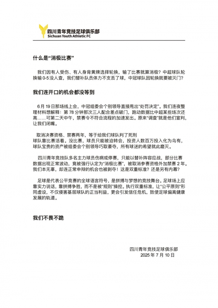 上个月,中国足协官方宣布,认定中冠四川青年竞技队消极比赛,取消他们未来两年的参赛资格。四川青年竞技此后发布声明抗议了足协的判决。