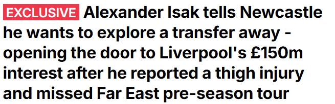 07月24日讯 邮报独家消息,伊萨克告知纽卡自己想寻求转会,这为利物浦引进他打开了大门。
