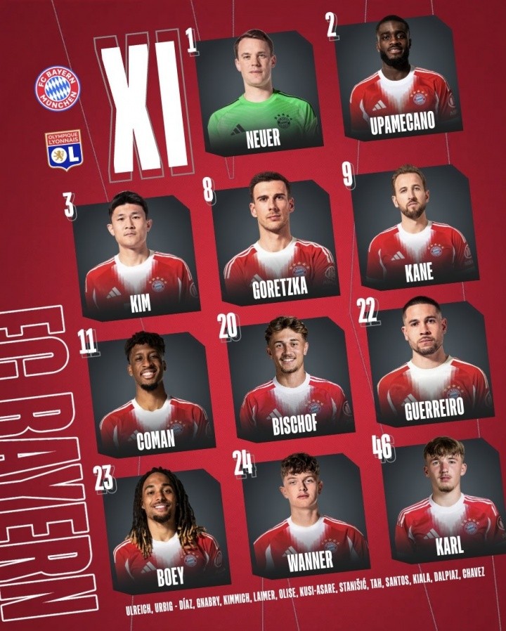 拜仁vs里昂首发:凯恩先发,新援迪亚斯替补,托利索战旧主