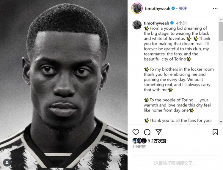 蒂莫西-维阿社媒写道:“从一个梦想登上大舞台的小男孩,到身披尤文黑白战袍的球员,感谢你们让这个梦想成真。我将永远感激这家俱乐部、我的队友、球迷以及美丽的都灵城。